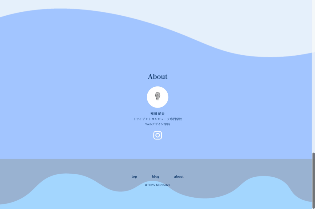 さらに、TopページやAboutページ、Footerには波をイメージした背景を取り入れ、サイト全体を通して海を感じられる構成にしています。